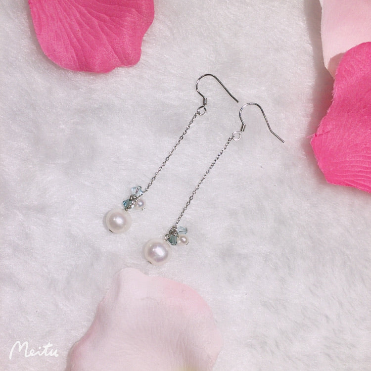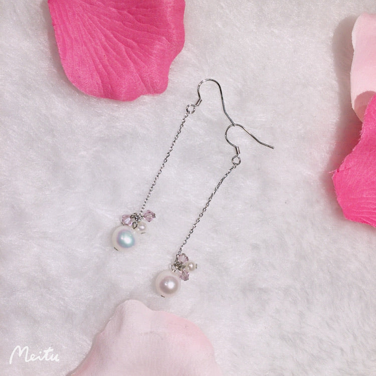 天然的海水珍珠,在強光下隱隱透出粉色的光澤,配上施華洛世奇的水晶,長鍊垂墜式耳環,增添飄逸仙女氣質唷!